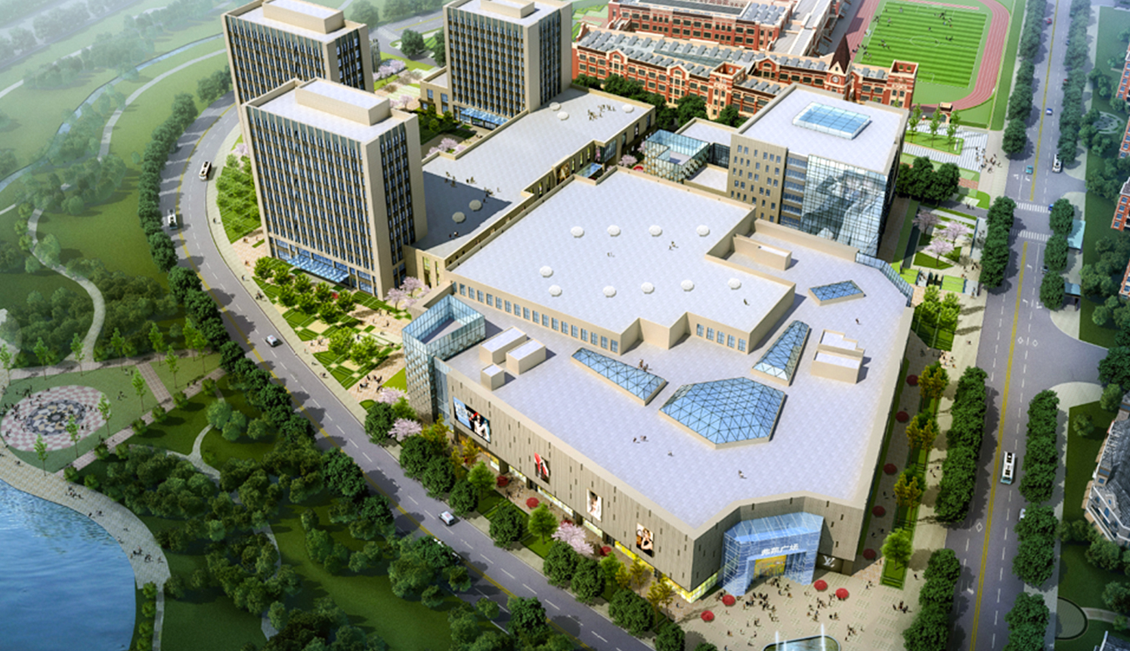 本項(xiàng)目包含商業(yè)、酒店、公寓、辦公、電影院等功能,作為一個(gè)商業(yè)綜合體滿足中德生態(tài)園周邊居民的生活、