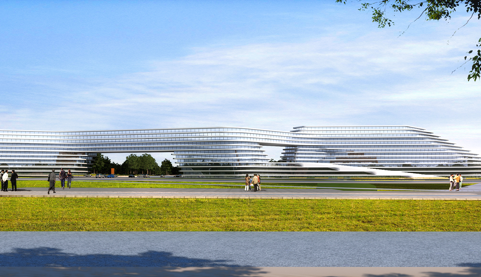 科學(xué)講堂位于中心區(qū)景觀主軸的中心腹地,其南的泄洪渠為景觀主軸的景觀帶。設(shè)計(jì)靈感源于中國天人合一的自然觀和社會(huì)觀,所謂仁者樂山智者樂水,通過對(duì)山、水肌理的分析與重構(gòu),轉(zhuǎn)換為建筑語言,形成獨(dú)具特色的建筑造型。建筑體量形成簡(jiǎn)單、沖突的場(chǎng)地氛圍,建筑南向正對(duì)園區(qū)中軸線,使得水平向延展的建筑生成了“東高西低”的無邊際界面。由“水面→河岸→場(chǎng)地→建筑”的溪水肌理驅(qū)動(dòng)建筑臨街面,逐步退后產(chǎn)生特有的河流沖刷意象。水流的蜿蜒曲折使建筑的轉(zhuǎn)彎處成洞,達(dá)到了內(nèi)外視線連續(xù)的綜合效果,并將對(duì)建筑的擠壓力平衡到建筑東西兩翼。建筑表皮通過對(duì)水的情緒變化等模擬,形成片狀的建筑造型。