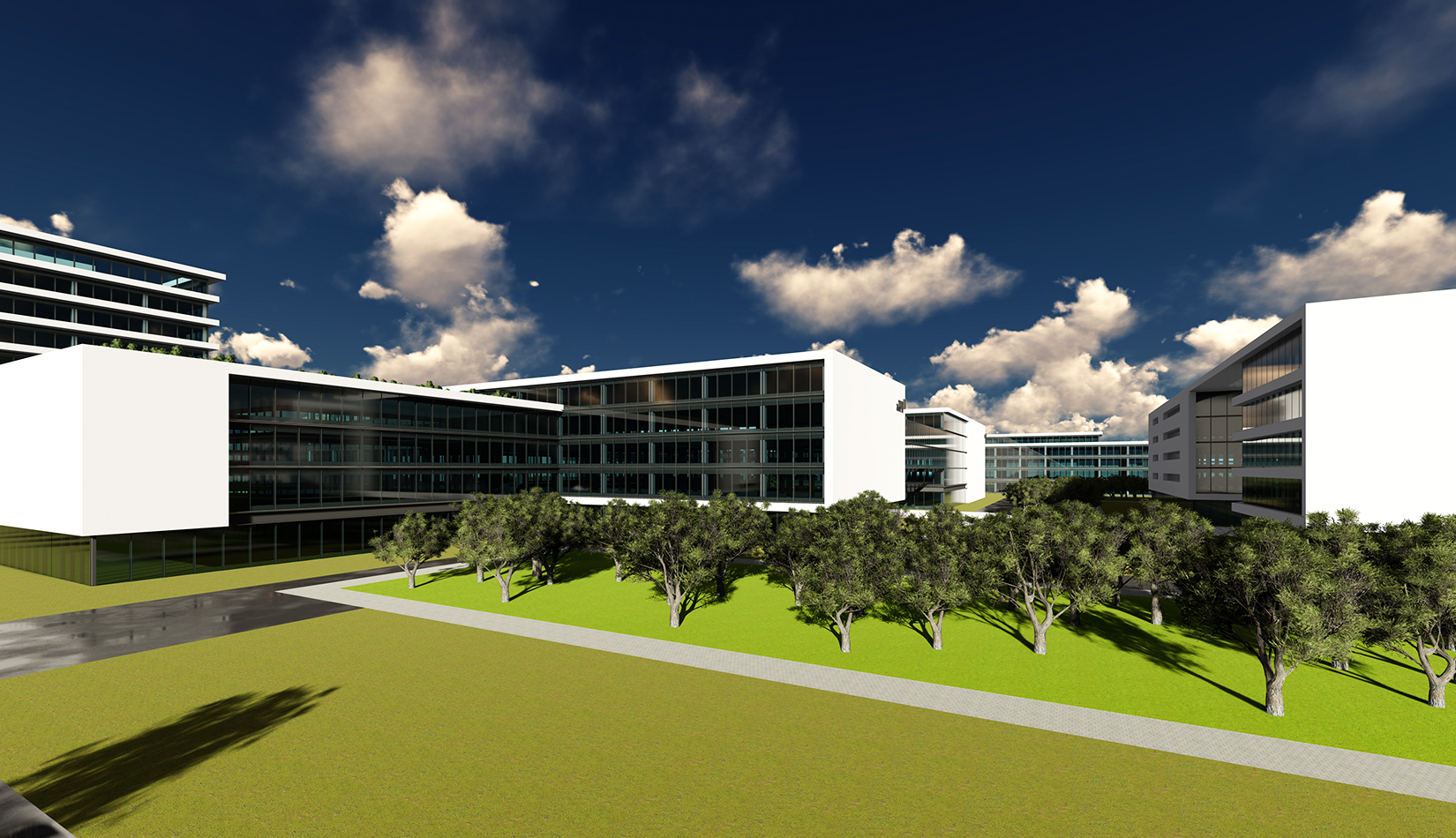 用全圍合式布局,形成兩個(gè)能量環(huán),為整個(gè)園區(qū)輸送無限動(dòng)力。活力三環(huán)的自由、靈活的建筑布局形式,為多元化的企業(yè)辦公提供各種空間選擇?;盍θh(huán)均與雙核中心相連,在吸取核心研發(fā)產(chǎn)業(yè)鏈能力同時(shí),不斷提升自己,向雙核中心注入新活力。通過五環(huán)的建筑空間形式,將多元功能塊組合在一起,形成一個(gè)共生循環(huán)系統(tǒng)。