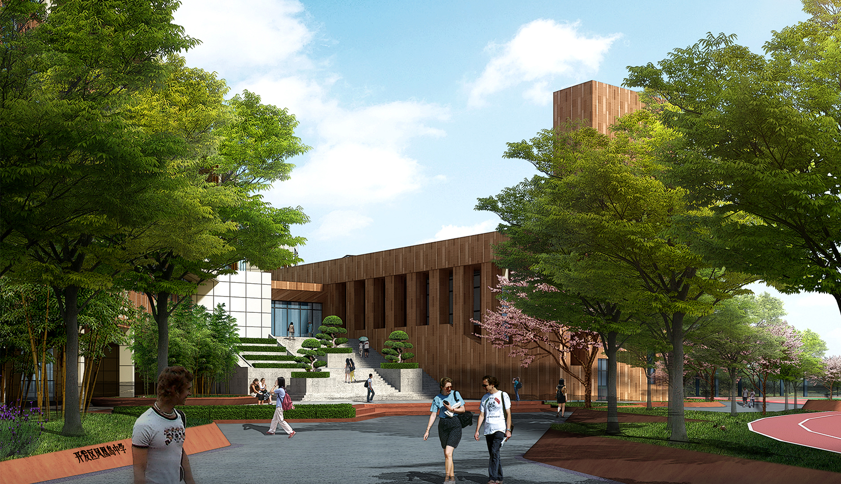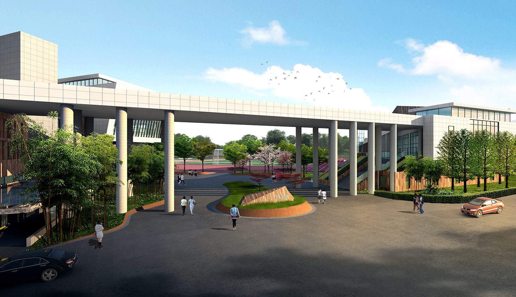 1. 將抽象化的鳳翎設(shè)計成特色種植,結(jié)合建筑形態(tài)配以流線型鋪裝設(shè)計,在鋪裝上增加鳳凰島中學(xué)校訓(xùn)校風(fēng)的細(xì)節(jié)設(shè)計,凸顯學(xué)校濃郁的文化氛圍以及室外景觀環(huán)境的精致。