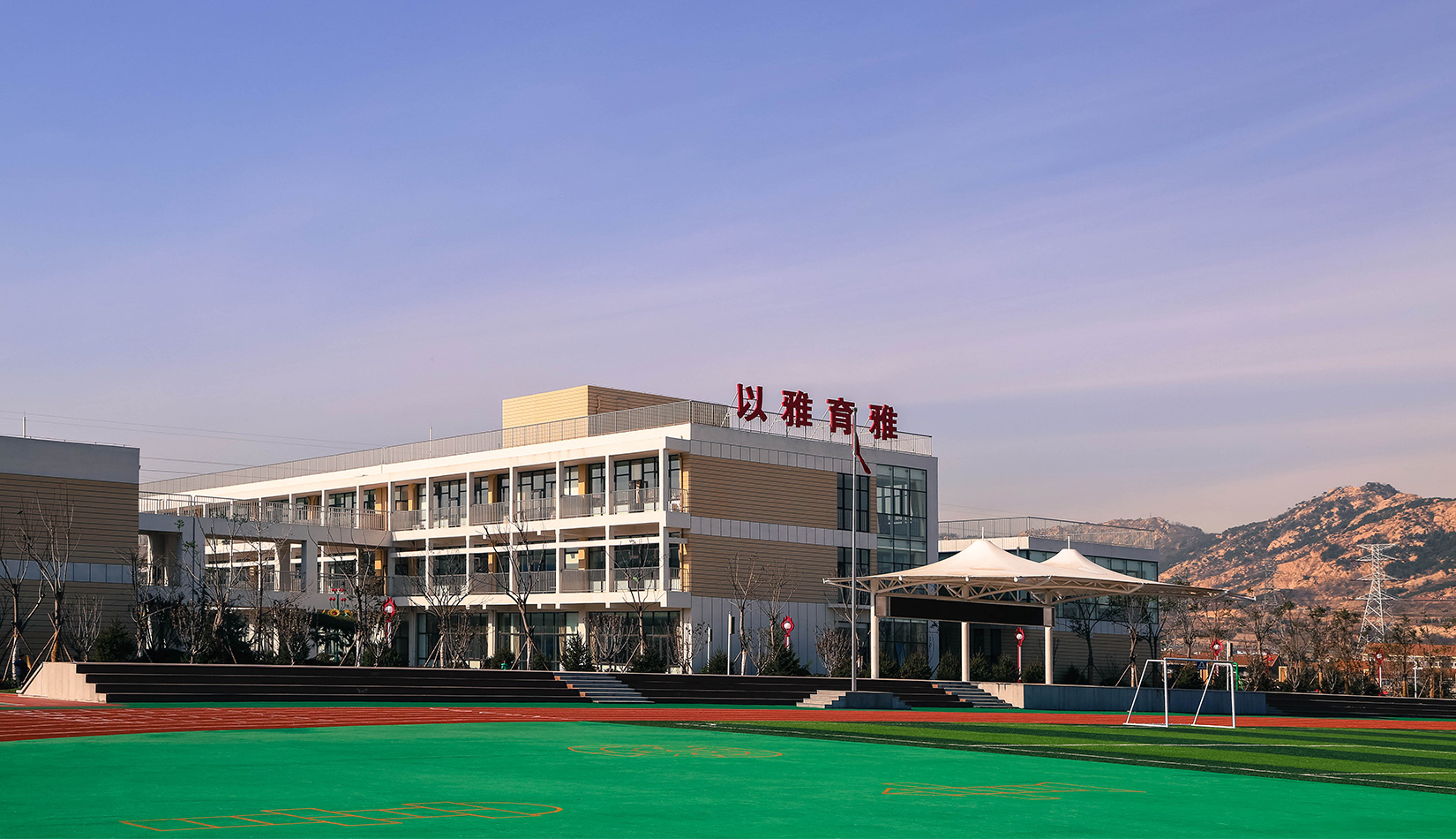 該項目通過幾個建筑單體與架空走廊的穿插連接將整個校區(qū)有機(jī)聯(lián)系起來,實現(xiàn)了建筑功能的整體性,完善了建筑可達(dá)性。形成的中庭空間可成為交流為主的平臺,營造了學(xué)習(xí)、活動為一體的校園氛圍。建筑外立面以簡潔的現(xiàn)代風(fēng)格為主,同時表現(xiàn)校園文化,主要采用黃色與白色真石漆形成色彩對比,在教室南立面、樓梯間、就餐區(qū)等采用整體通透的玻璃幕墻與實墻形成虛實對比,形成簡潔而不失活潑的建筑風(fēng)格。利用借景等手法進(jìn)行室外綠化設(shè)計,整體打造一個高品質(zhì)的學(xué)校環(huán)境。