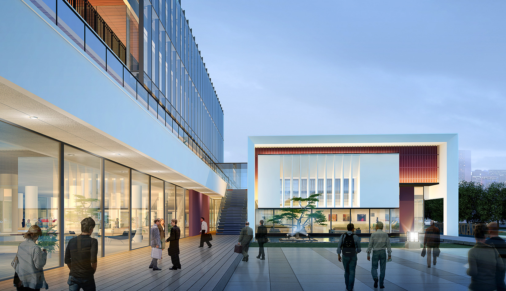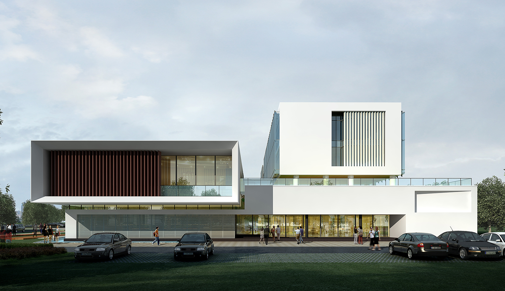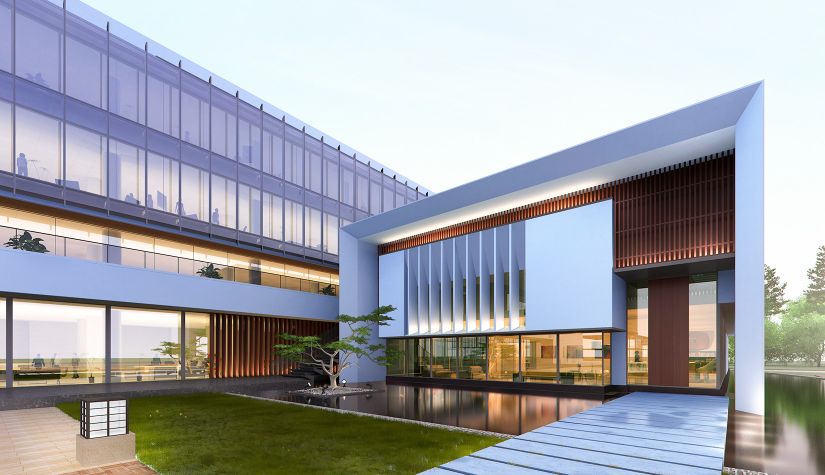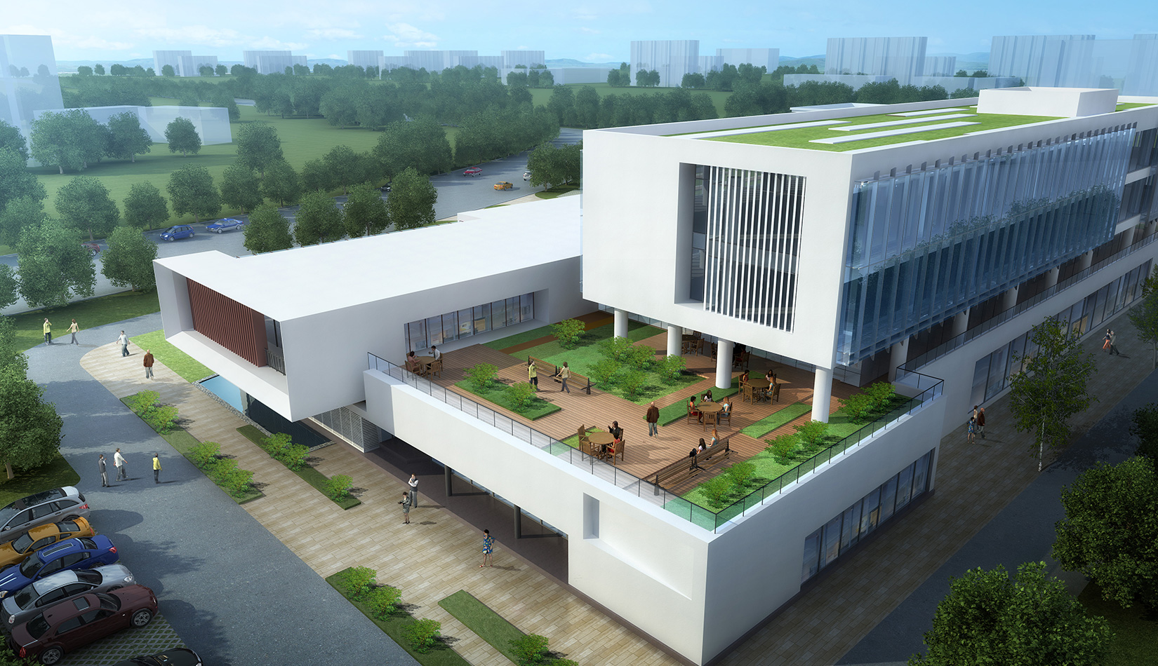 作為中韓貿(mào)易合作區(qū)一期啟動區(qū)的重點項目,其承擔著對外展示以及為后續(xù)發(fā)展提供服務(wù)平臺的功能。因此設(shè)計力求穩(wěn)重大氣,以4 層的體量打造出地標性的建筑。設(shè)計運用簡潔的外形、寧靜的色彩,外立面以白色涂料和木格柵為主,尊重自然,打造一種平和寧靜的感覺。在空間設(shè)計上通過共享空間、上人露臺和一層大平臺,創(chuàng)造出舒適宜人的工作環(huán)境;在技術(shù)上通過地源熱泵、呼吸式幕墻、雨水收集等的應(yīng)用,實現(xiàn)建筑的綠色節(jié)能環(huán)保。