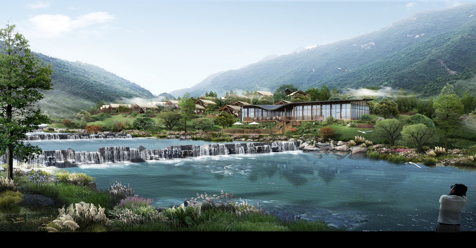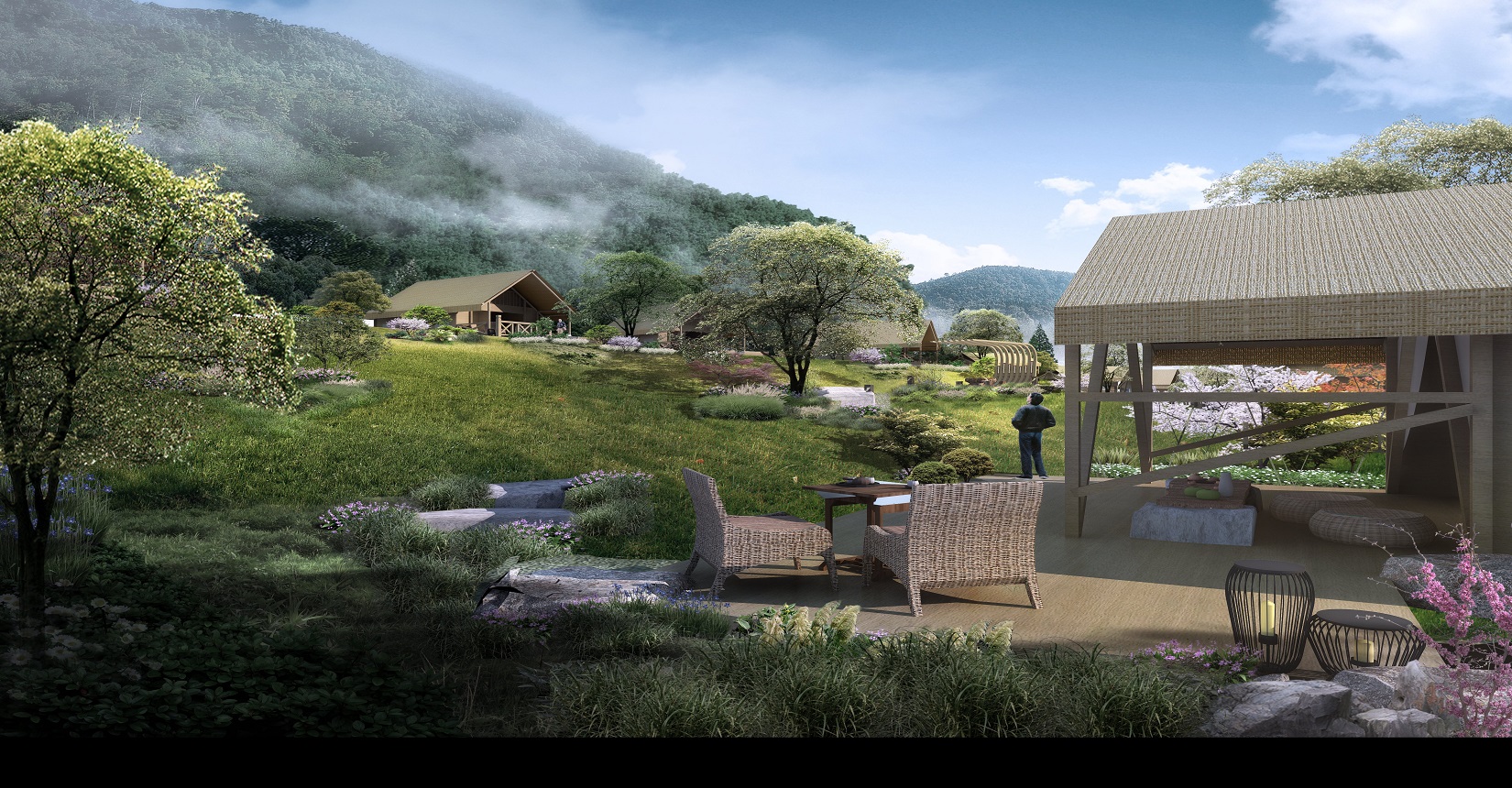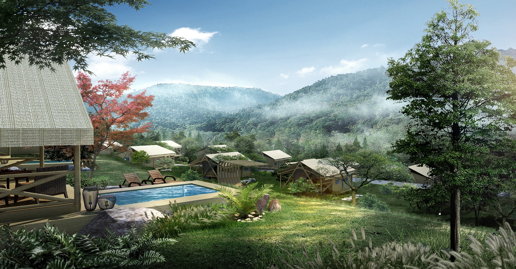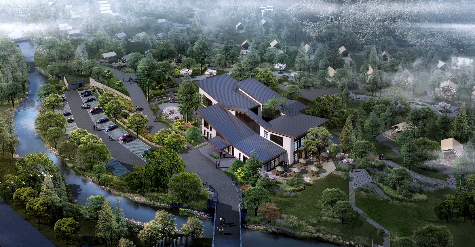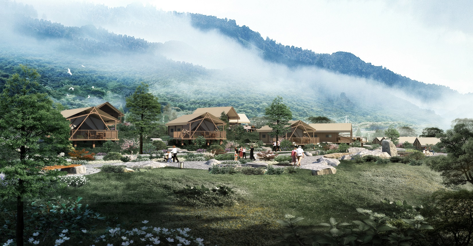 本項目的定位為自然、野奢的景觀風格。對于野奢度假酒店景觀環(huán)境設(shè)計遵從“野”“奢”兩點,融入荒野生態(tài)的設(shè)計理念,又要與場地相融合、與原生態(tài)相映、與當?shù)氐拿袼罪L情相交匯,突出當?shù)氐奈幕黝},強調(diào)高品質(zhì)的自然、野奢度假,從而打造出一個具備個性與特色,使游客能夠享受到自然野趣體驗的景觀環(huán)境。